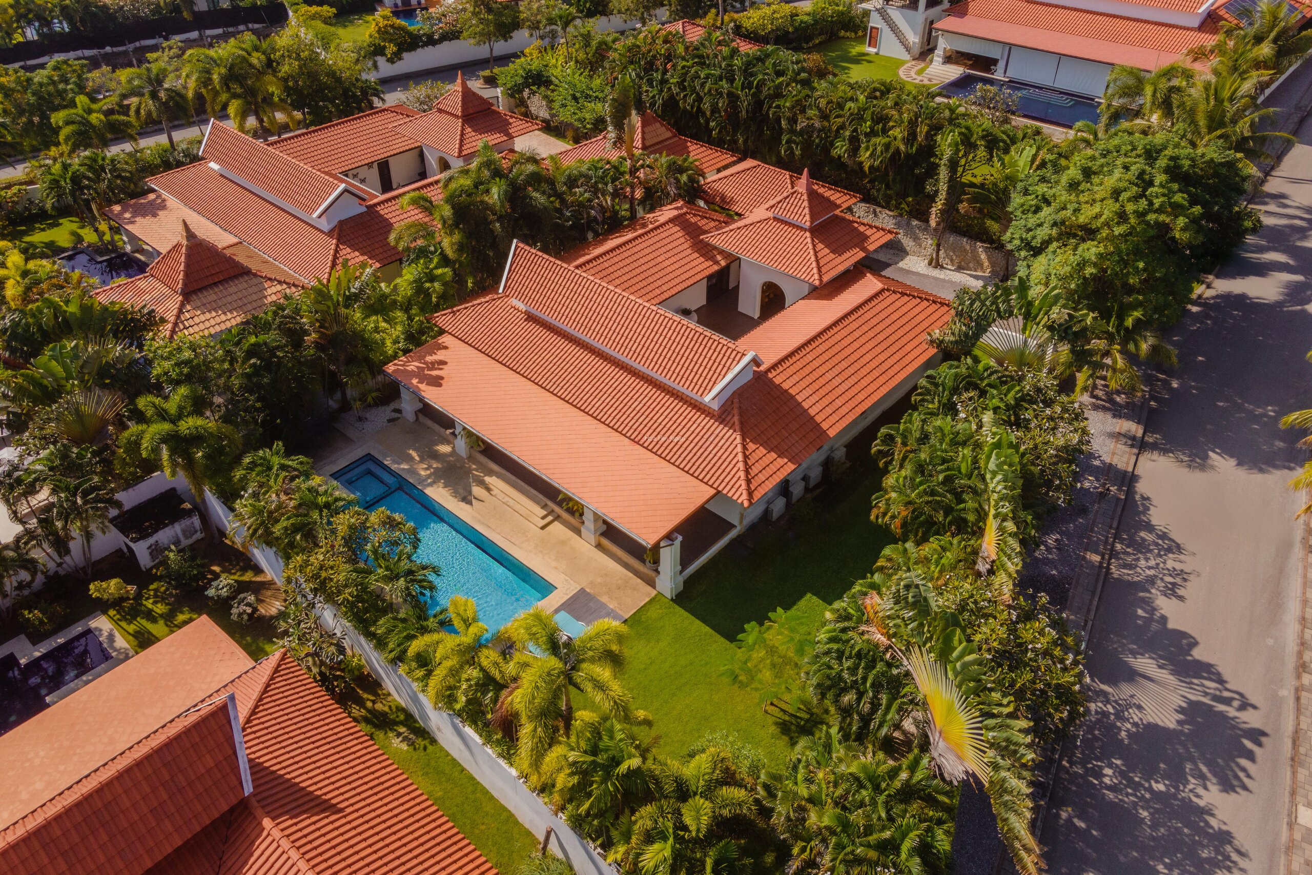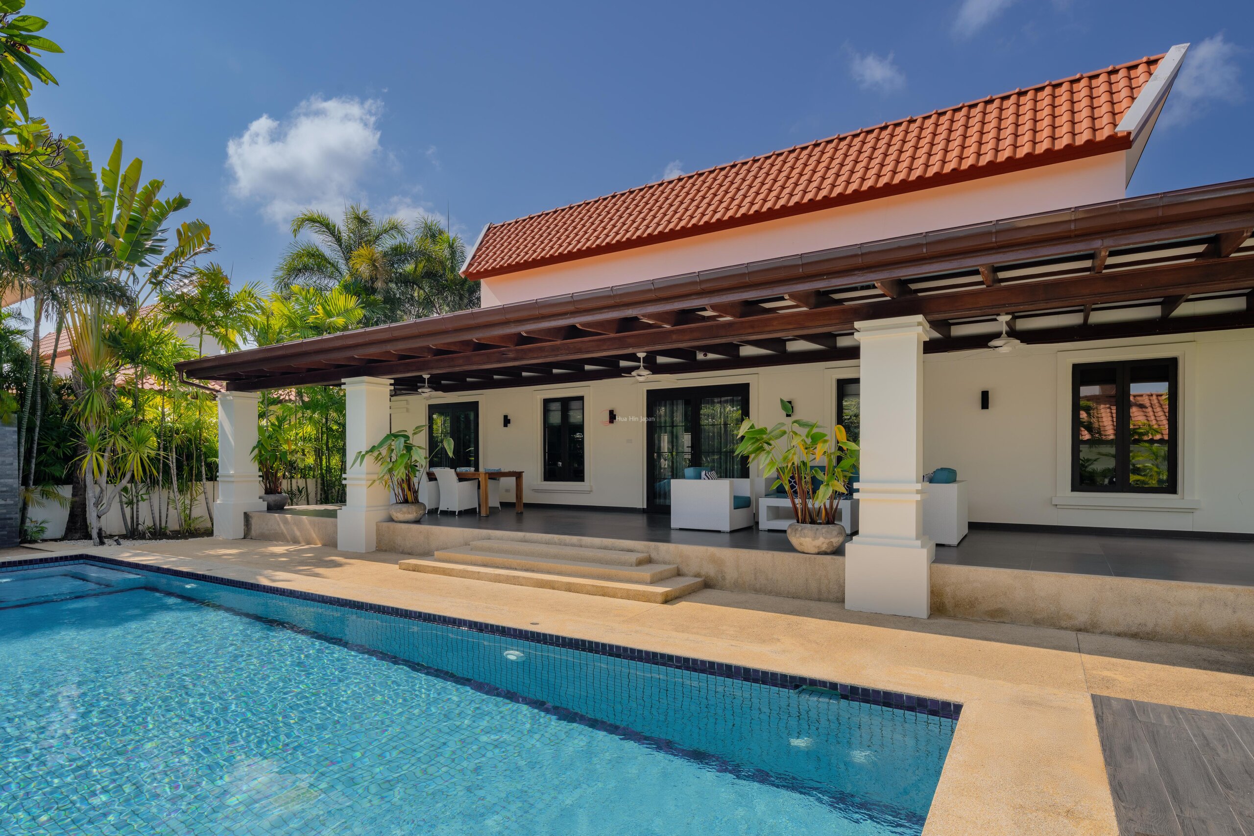 176m²のリビング、64m²のテラス、96m²の中庭を備えたこのプール付きヴィラは、1,060m²の広大な敷地に位置し、2022年に最高水準に全面改装され、パイナップル・バレー・ゴルフクラブ会員権が付いています。