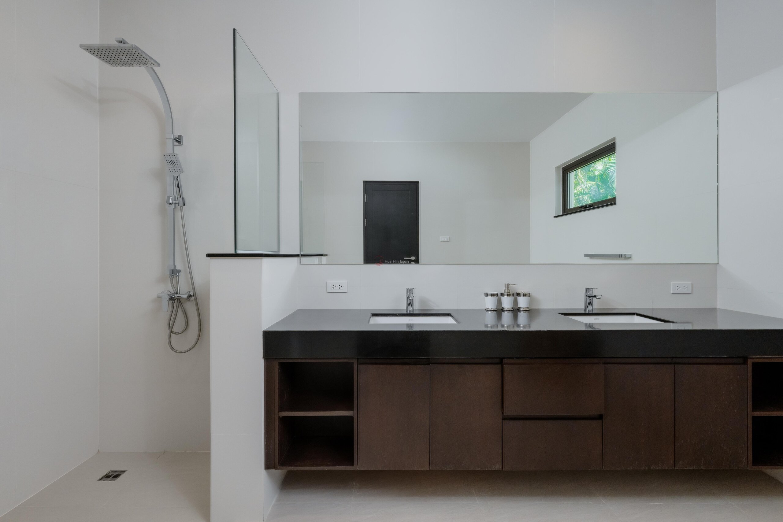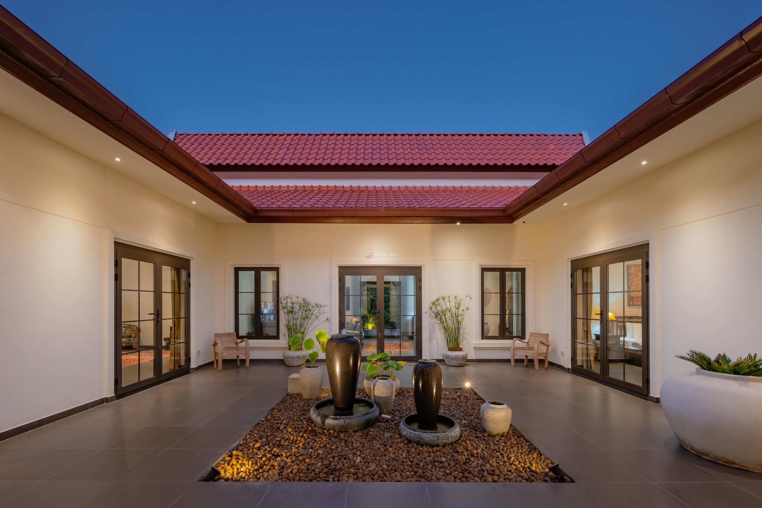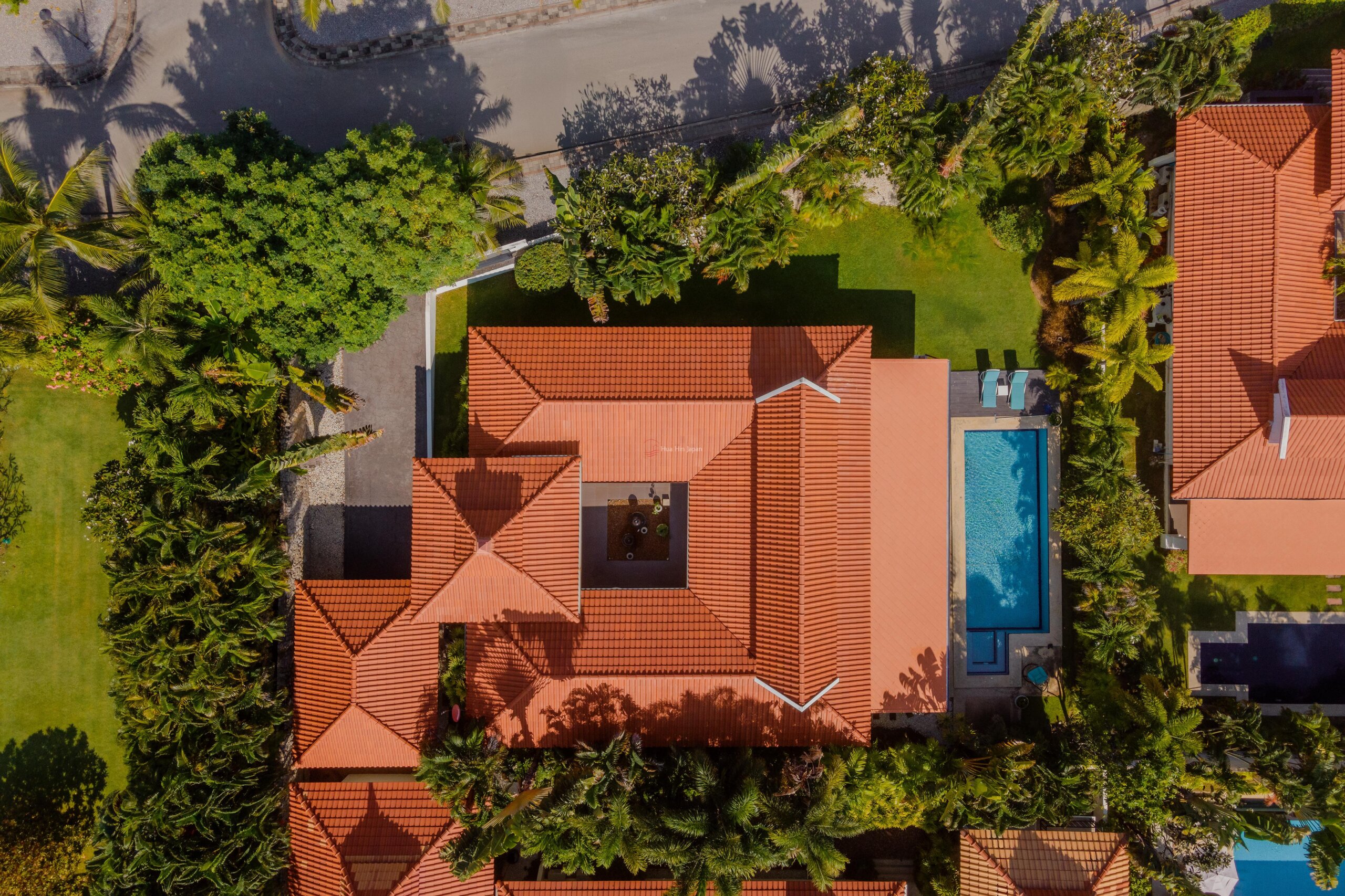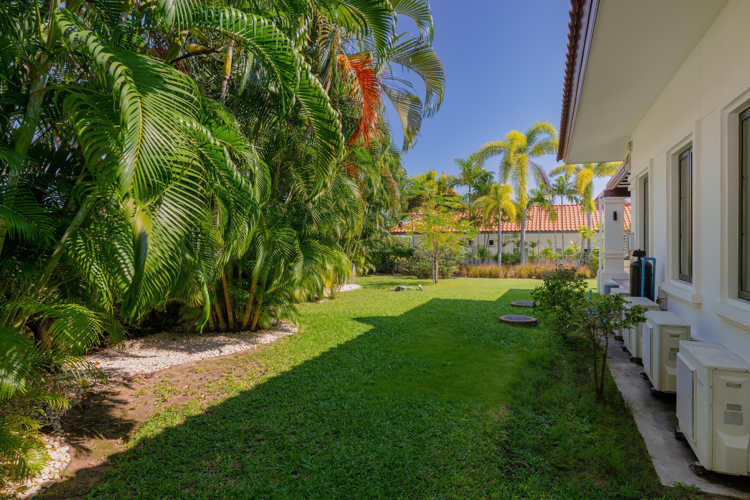 ヴィラへの入り口は、ゲスト用洗面所がある、水場のある固い造りの中庭を通っている。ヴィラの後方には大きなテラスがあり、10mx5.5mのプール、庭、デッキエリアを見渡すことができる。.
