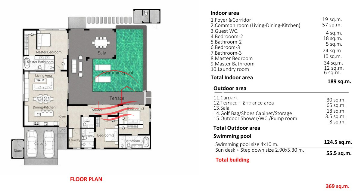 - タイプA:3ベッドルーム、3.5バスルームの平屋ヴィラ。