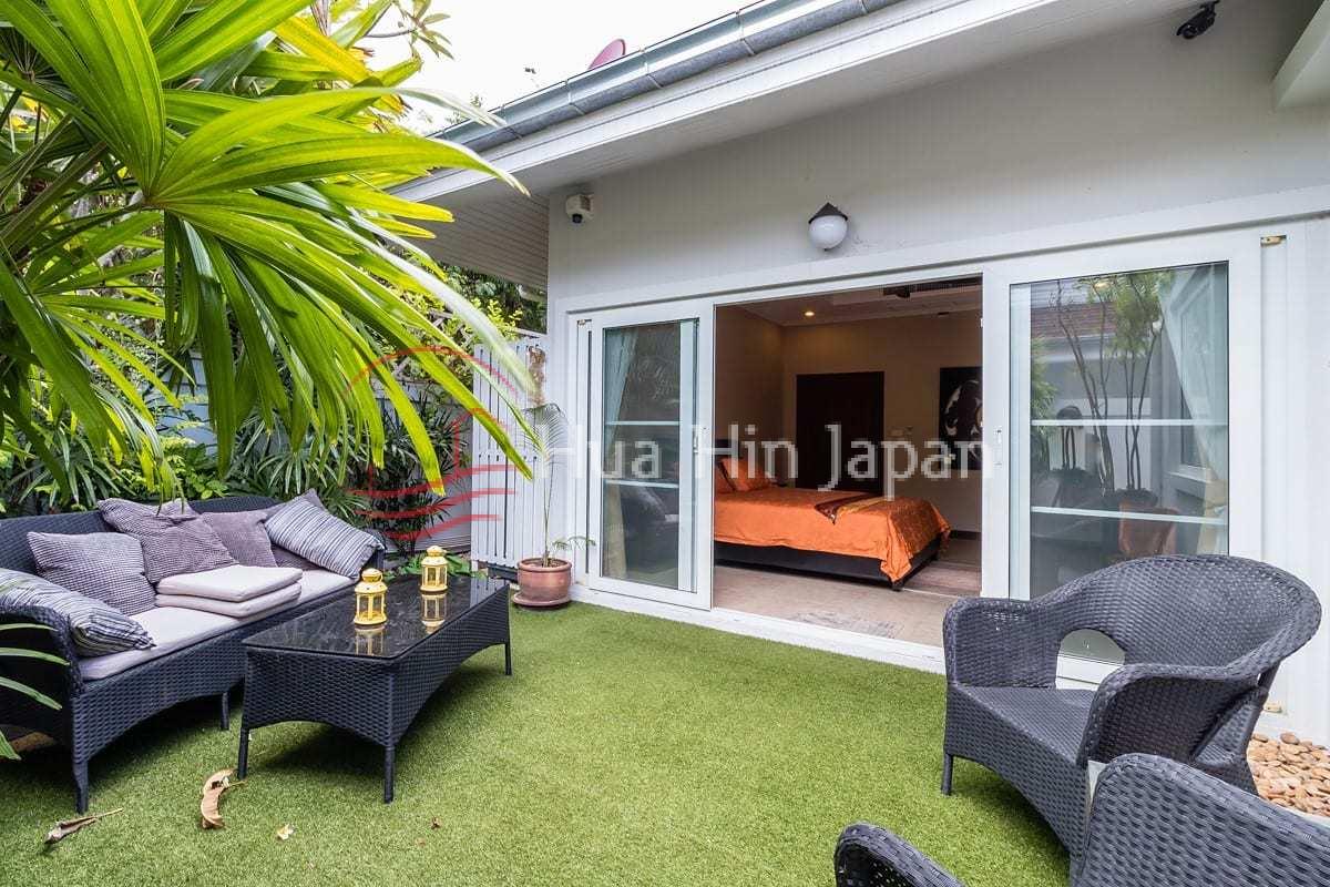 - 手入れが簡単な庭。庭にはいくつかのコンセント、低電圧ライトがある。.