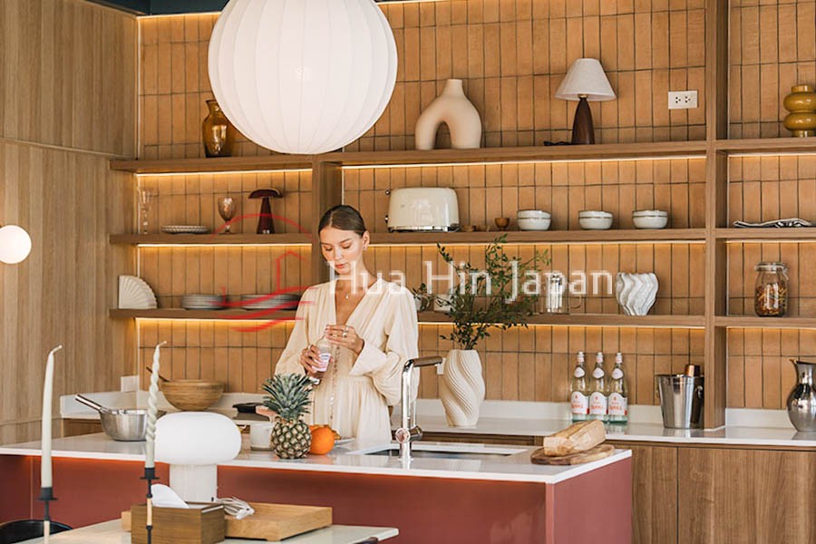 1階は吹き抜けのある開放的なリビングとダイニングスペースで構成され、スイミングプールに直接出入りできるテラスと庭に通じている。キッチンエリアの奥には、専用のバスルームを備えたメイド・ランドリー・ルームもあります。晩酌を楽しんだり、プライベート・バーベキュー・パーティーを開いたりするのに最適な場所です。.